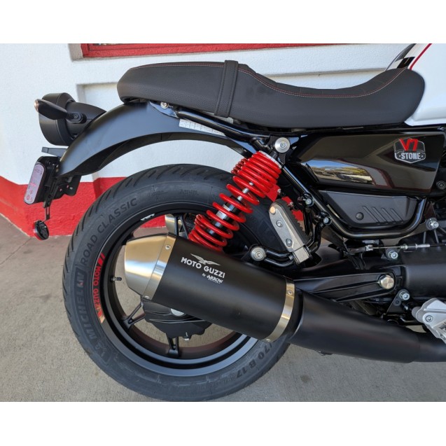 The V7 "Ten" celebrates 10 years of the Moto Guzzi "The Clan", and features many upgrades from a the basic Stone model, including, Arrow Exhaust, red shocks, bar end mirrors, and many other small details distinguishing it from the pack.
